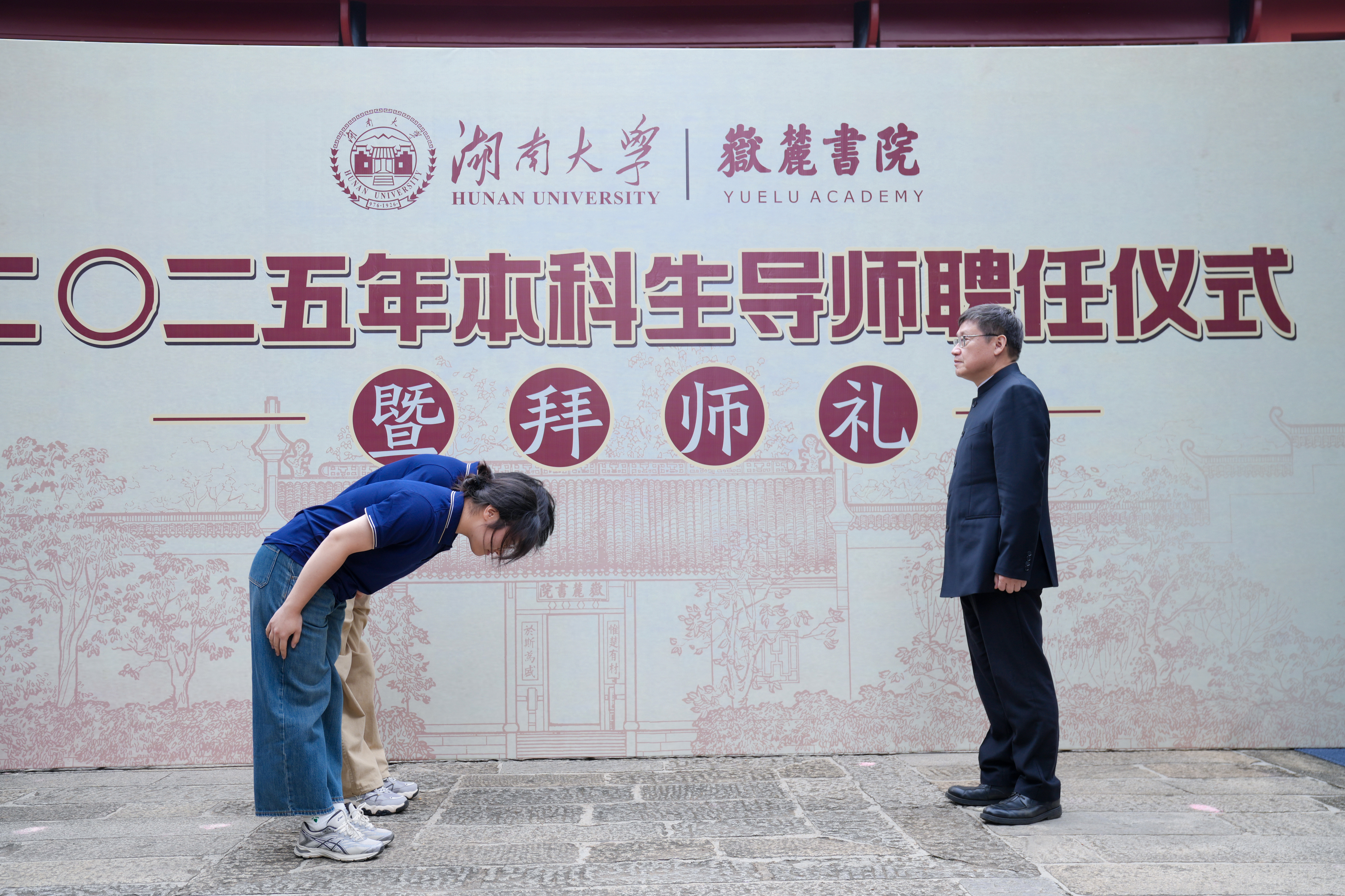 在向孔子行三鞠躬礼后,师生齐诵韩愈名篇《师说》,拉开了活动序幕。在当代人才培养过程中,伟德国际推行特色“四维本科生导师制”,不断探索传统教育智慧与现代人才培养的融合路径。在本科生导师聘任仪式上,5位老师受聘为班导师,61位老师受聘为学业导师,28位老师受聘为学术兴趣导师,41名高年级研究生、本科生受聘为生活导师。拜师礼现场,250余名本硕博新生,以师门为单位,依次上台向导师行鞠躬礼,在沉浸式体验中感悟中华师道的时代传承,增强对中华文化的认同与自信。